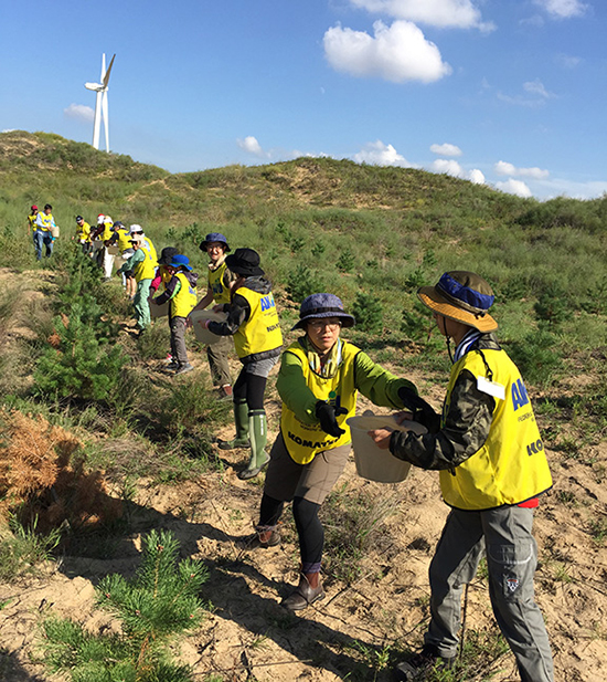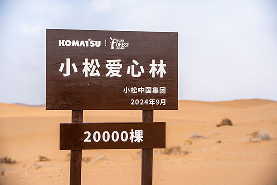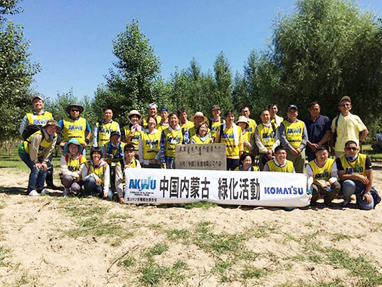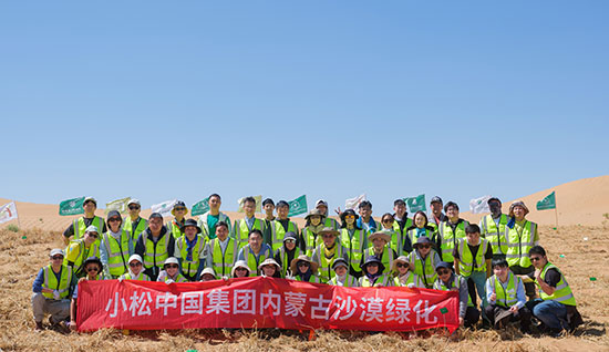 自2005年起,小松开始捐款资助非营利组织在中国内蒙古科尔沁地区开展的沙漠绿化活动。2009年后,小松日本总公司和小松中国集团各公司开始组织员工作为志愿者共同赴当地参加植树活动。2024年开始,小松中国与中国绿化基金会合作,携手在内蒙古阿拉善地区支持沙漠绿化项目。经过十几年的持续努力,已累计植树超过43万棵,存活率达71%。